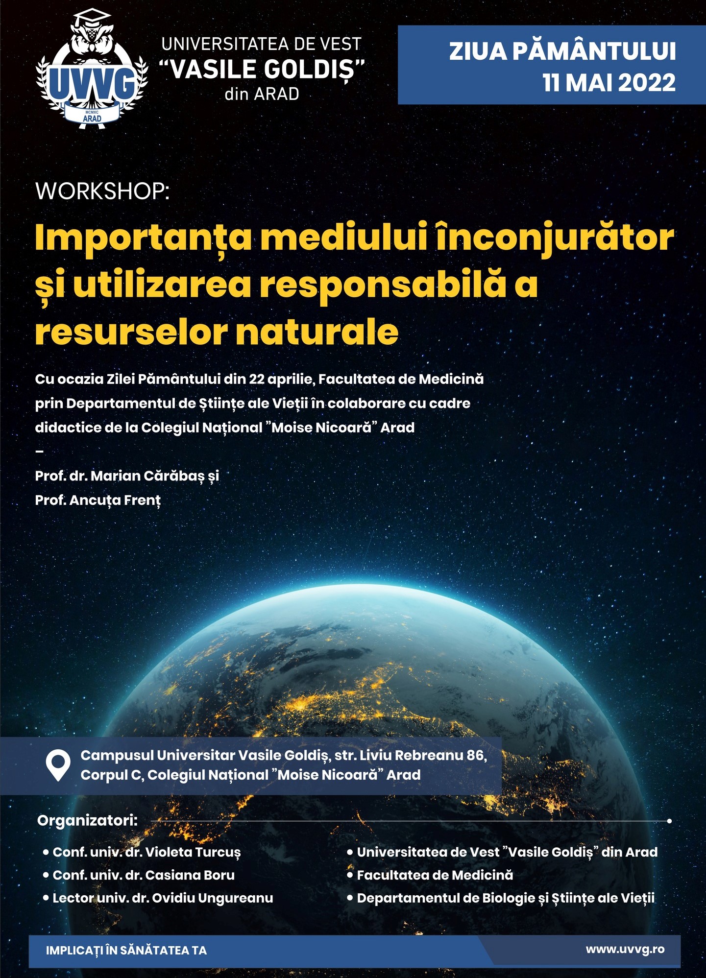 La inițiativa conducerii Universităţii de Vest „Vasile Goldiş” din Arad și a doamnei rector, prof. univ. dr. Coralia Adina Cotoraci, anual, de Ziua Pâmântului, se desfășoară o serie de manifestări științifice cum ar fi: conferințe, congrese, work-shopuri, dar și activități de specialitate în domeniul biomedical și ecologic. Toate cu rolul de a scoate în evidenţă importanţa mediului înconjurător şi al resurselor naturale. În acest context a avut loc workshop-ul „Importanța mediului înconjurător și utilizarea responsabilă a resurselor naturale”. Acţiunea a fost organizată de Facultatea de Medicină UVVG, prin Departamentul de Biologie şi Științe ale Vieții, sub coordonarea doamnei conf. univ. dr. Violeta Turcuș și a doamnei conf. univ. dr. Casiana Boru. Manifestarea s-a desfășurat la Colegiul „Moise Nicoară” Arad, unde au participat elevii din clasele a 8-a, a 9-a și a 10-a, sub îndrumarea prof. dr. Marian Cărăbaș și prof. Ancuța Frenț, dar și la Universitatea de Vest „Vasile Goldiș“ din Arad, unde au participat studenții de la programele de studiu: Biologie și Asistență Medicală Generală.