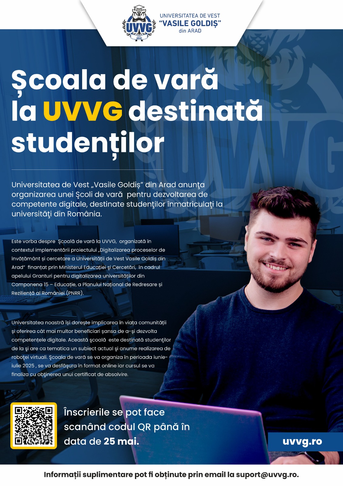 Universitatea de Vest „Vasile Goldiș” din Arad anunţa organizarea unei Şcoli de vară pentru dezvoltarea de competente digitale, destinate studenţilor [...]
