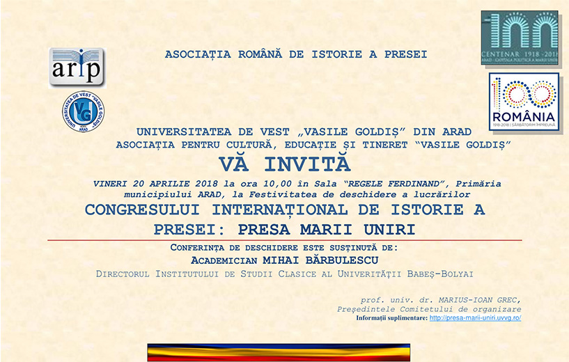 Asociația Română de Istorie a Presei, împreună cu Universitatea de Vest „Vasile Goldiș" din Arad organizează Congresul Internațional de Istorie [...]