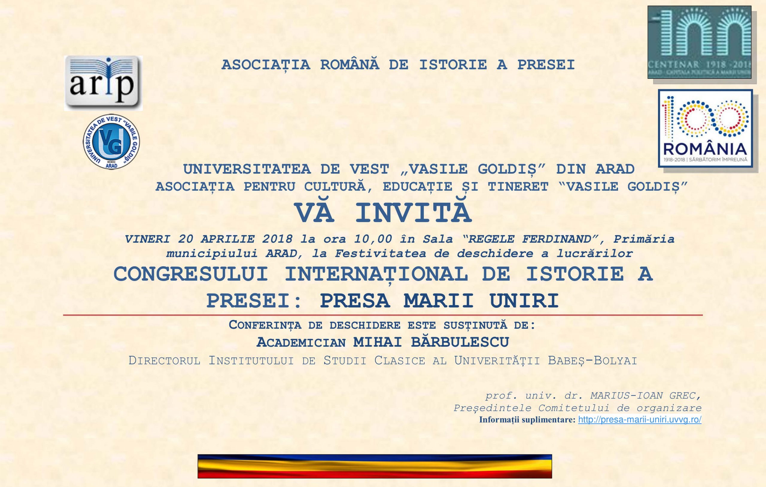 Congresul Internațional de Istorie a Presei, în organizarea Asociației Române de Istorie a Presei şi Universitatea de Vest „Vasile Goldiș" [...]