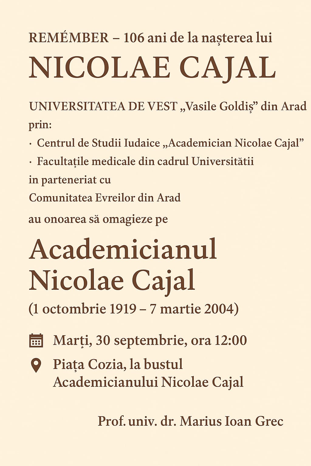 Universitatea de Vest „Vasile Goldiș” din Arad a organizat un eveniment comemorativ de înaltă ținută academică, dedicat marcării a 106 ani de la nașterea academicianului Nicolae Cajal, una dintre marile personalități ale științei, medicinei și culturii românești. Manifestarea s-a desfășurat sub egida universității, prin Centrul de Studii Iudaice „Academician Nicolae Cajal”, într-o formulă de parteneriat care a reunit facultățile medicale din cadrul UVVG și Comunitatea Evreilor din Arad, evidențiind spiritul de dialog intercultural, cooperare și respect care i-au definit activitatea și personalitatea.