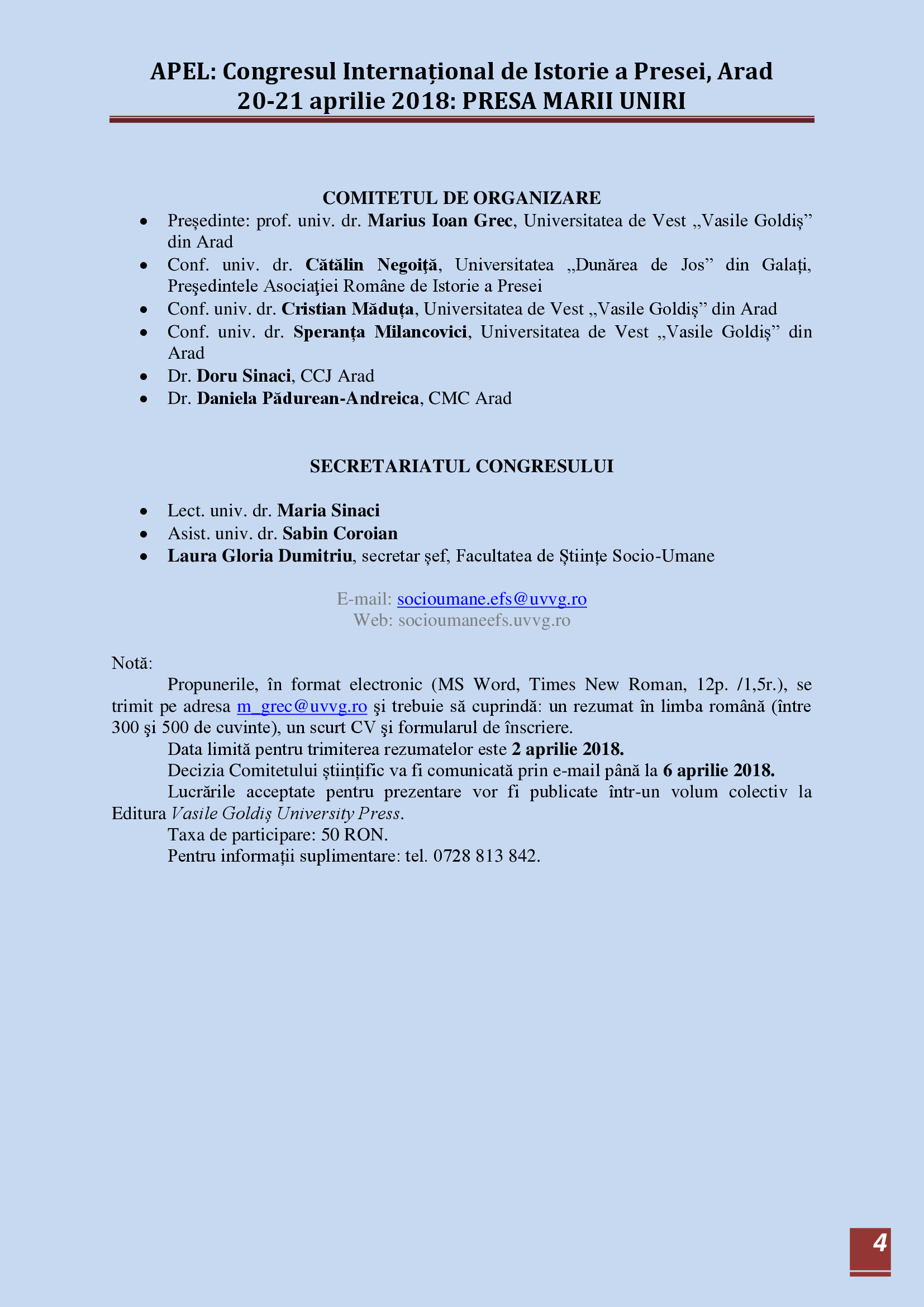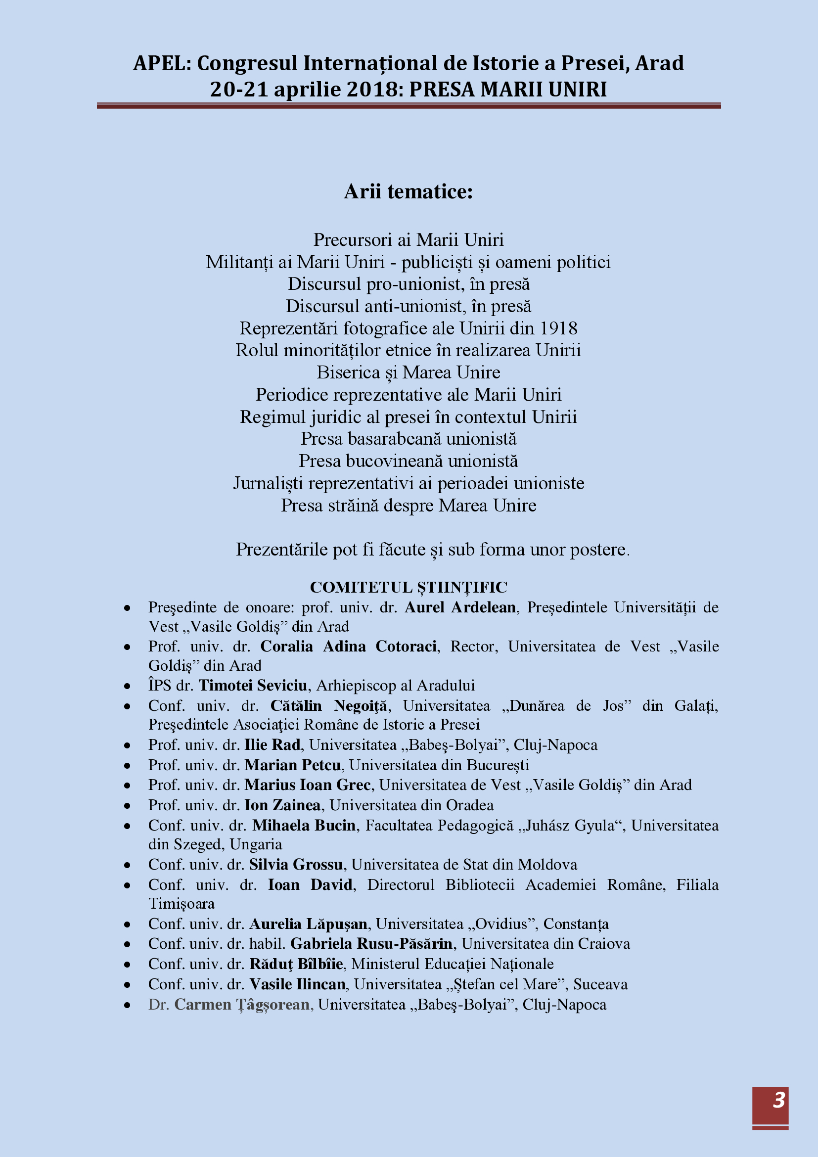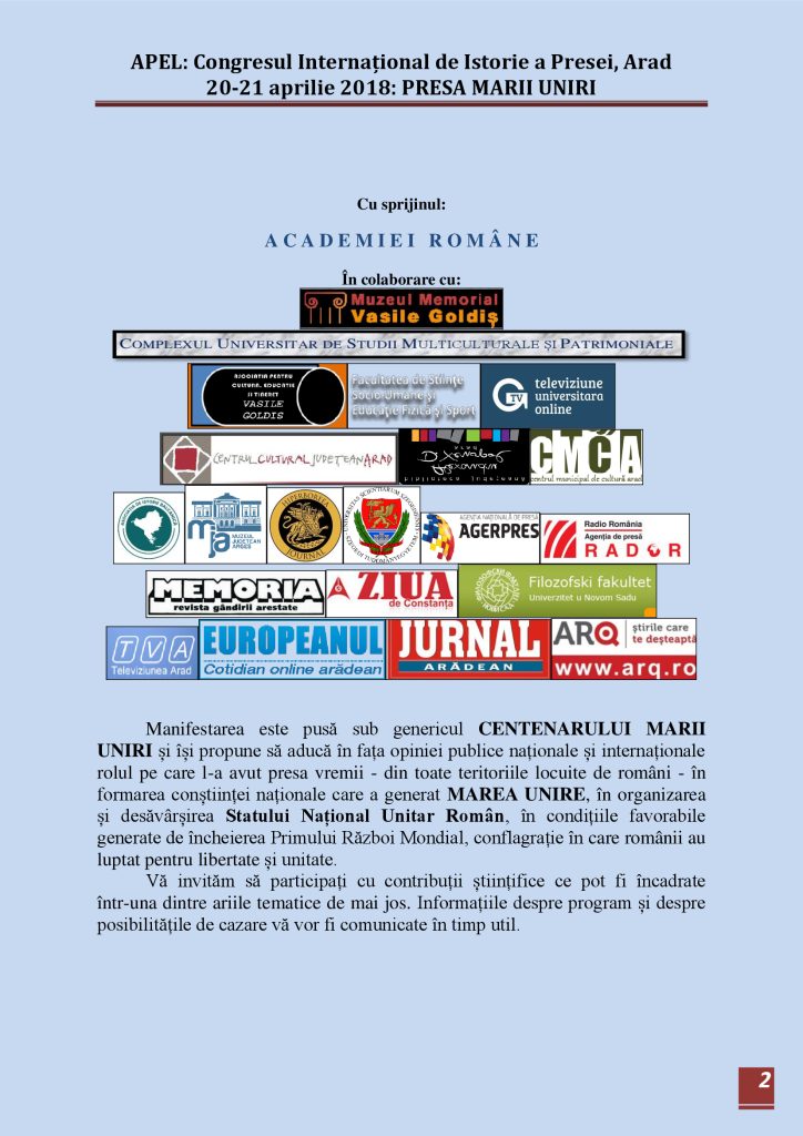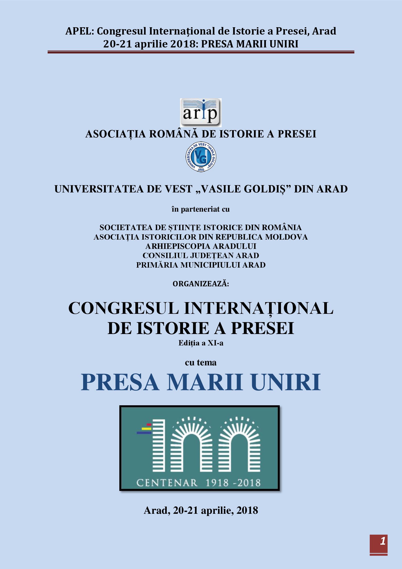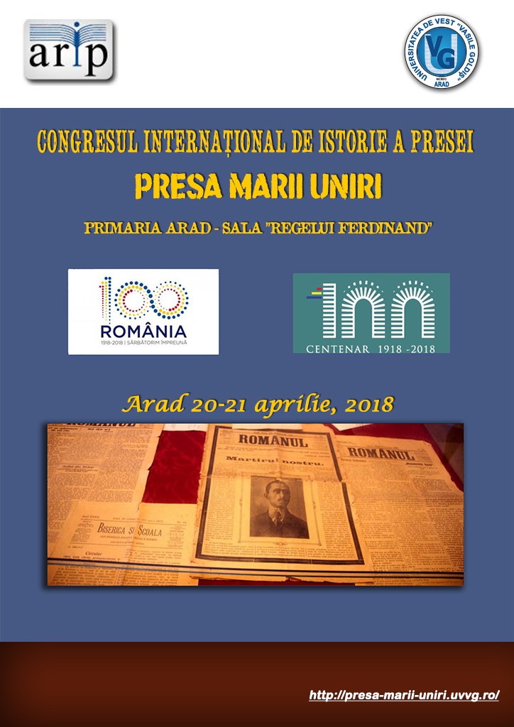 Asociația Română de Istorie a Presei, împreună cu Universitatea de Vest „Vasile Goldiș” din Arad organizează Congresul Internațional de Istorie a Presei, cu tema „Presa Marii Uniri”, în perioada 20-21 aprilie 2018.