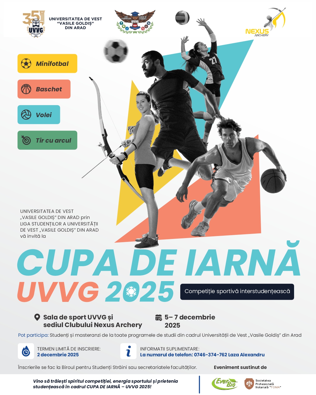 De asemenea, adresăm mulțumiri domnului Mihnea Marșieu, președintele Clubului Nexus Archery, pentru frumoasa colaborare și implicare în organizarea concursului de tir cu arcul; Alumni UVVG – Alin Chișiu, manager EverBio, și Oana Toma, Societatea Notarială Toma – oameni deosebiți, absolvenți ai universității noastre, care sprijină cu drag astfel de inițiative.