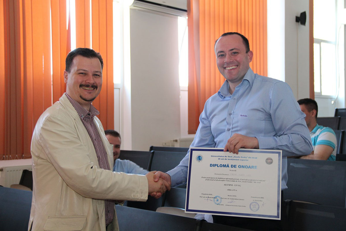 Daniel Gică, absolvent al Facultăţii de Ştiinţe Juridice în anul 2013: „Actualmente lucrez la o bancă. Facultatea de Drept m-a ajutat să devin persoana de astăzi şi anume prin voluntariat. Prin acţiunile făcute alături de colegul meu Adrian Manta, prin Liga Studenţească, prin organizaţia pe care am înfiinţat-o în anul 2010 dar care, din păcate, astăzi nu mai există şi aceasta trebuie să fie un semnal de alarmă pentru toţi profesorii de la Facultatea de Drept pentru că partea de voluntariat a studenţilor trebuie să fie foarte activă în viaţa academică a Universităţii. Fac referire aici la organizaţia ELSA, care a luat fiinţă în anul 2010, la iniţiativa mea şi a încă doi colegi. Cred că acest lucru ţine şi de studenţi dar şi de profesori pentru că în timpul studenţiei noastre aveam o legătură foarte strânsă cu profesorii, mergeam nu doar la cursuri împreună cu ei, ci făceam şcoli de vară şi procese simulate, care îi ajutau pe tineri să fie în postura de judecător, avocat sau procuror. Mi-ar face mare plăcere ca aceste întâlniri organizate să continue an de an, deoarece mă simt mândru să fac parte din marea familie a Universităţii de Vest „Vasile Goldiş”.