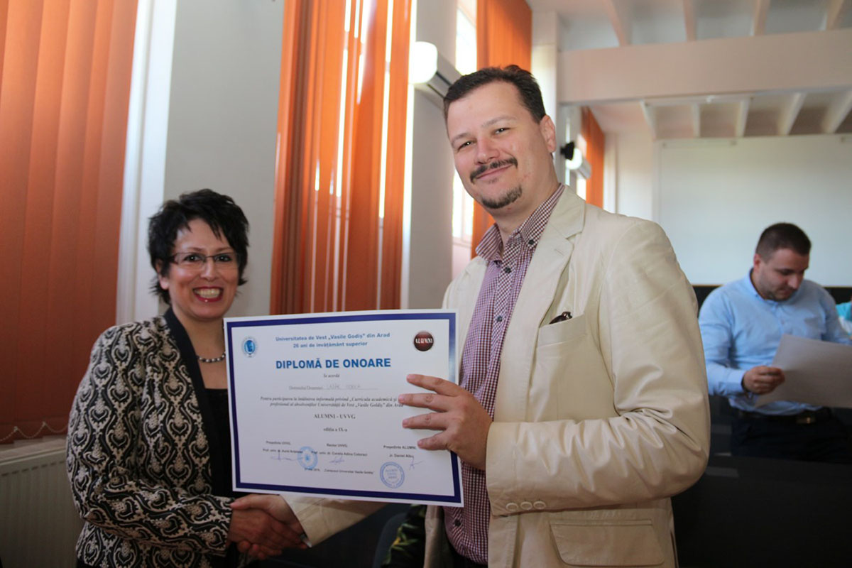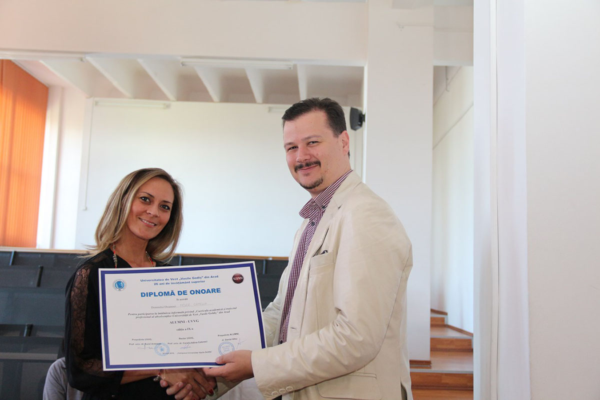 Camelia Moler, absolventă promoţia 2008 a UVVG, profilul Engleză-Franceză – Limbi moderne aplicate: „Pot să spun că sunt mândră că am absolvit această Universitate, această Facultate, deoarece imediat după ce am terminat Facultatea am reuşit să obţin autorizaţia de traducător de la Bucureşti, de la Ministerul Justiţiei, ca atare chiar lucrez în acest domeniu şi colaborez cu foştii mei profesori din cadrul Universităţii “Vasile Goldiş” de la acest profil. Reuşim împreună să facem ceva util pentru învăţământul arădean: am scris cărţi împreună, suntem în lucru şi pe punctul de a scoate o altă cărticică de limba engleză pentru copii. Totodată lucrez în media, alături de colegul meu care este şi mentorul meu în ceea ce înseamnă jurnalism, lucrăm la un ziar numit “Educaţia”, întrucât o mică parte a timpului meu o dedic învăţământului şi nu există pe acest domeniu o revistă a judeţului nostru, ca atare ziarul “Educaţia” unde sunt redactor şef se ocupă de promovarea exclusivă a acestei ramuri de învăţământ de la nivel preşcolar până la cel universitar. Îmbin toate aceste puncte – învăţământ, traduceri autorizate, jurnalism – şi cu mare plăcere folosesc tot ceea ce această Universitate mi-a oferit. Sunt pe aceeaşi “lungime de undă”, dacă pot spune aşa, cu d-na prof. dr. asupra faptului că absolvenţii străini ai acestei Universităţi sunt mândri de profilul pe care l-au absolvit şi de cadrele didactice ale acesteia. Deoarece meseria de traducător îţi oferă şansa să colaborezi foarte mult, în profesia mea mă întâlnesc cu mulţi absolvenţi ai Universităţii noastre, pe diferite specializări, şi ne bucurăm şi suntem mândri că am absolvit această Universitate. Este o lume frumoasă, mă bucur foarte mult că am avut şansa să fac parte din ea şi sper ca această colaborare pe care o desfăşurăm să fie pe o perioadă îndelungată. Vă mulţumesc pentru că m-aţi ascultat”.