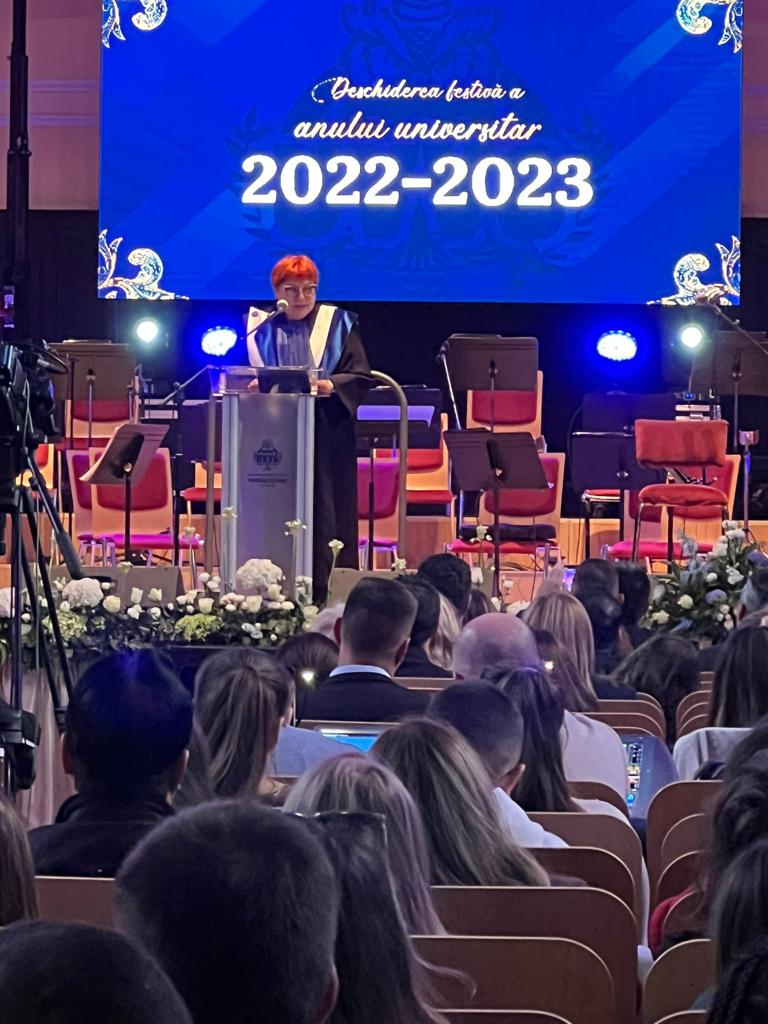 Festivitatea a continuat în sala Filarmonicii din Arad, unde Doamna Rector, prof. univ. dr. habil. Coralia Cotoraci a avut cuvântul de deschidere, prin care a transmis studenților mult succes în noul an universitar.