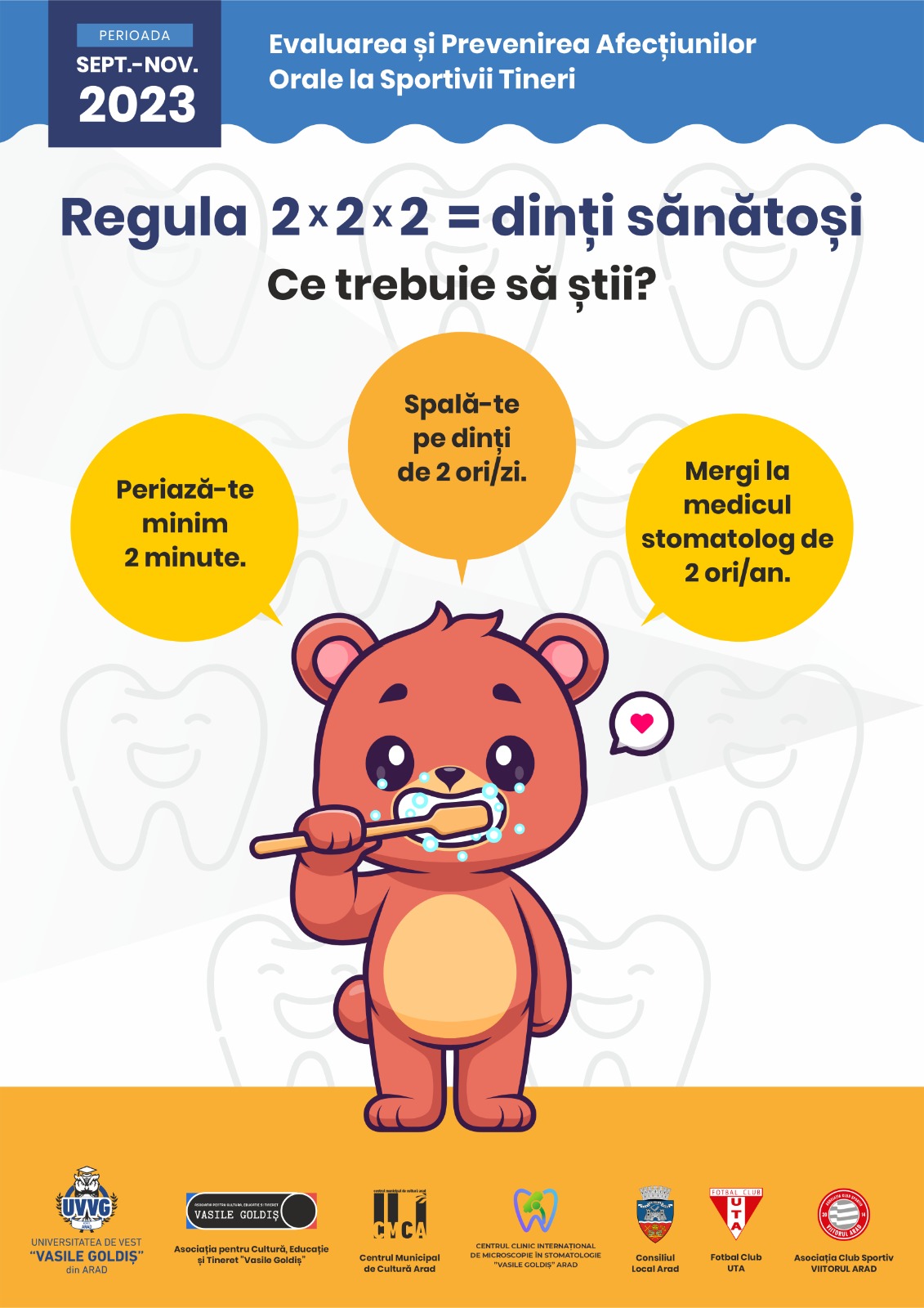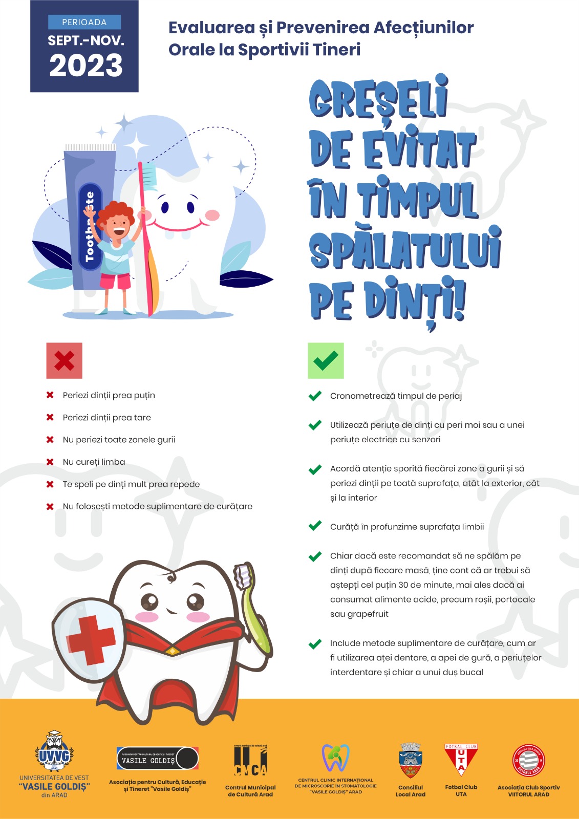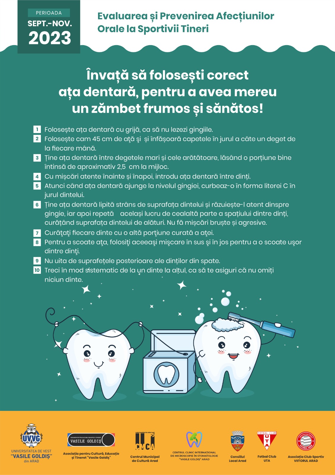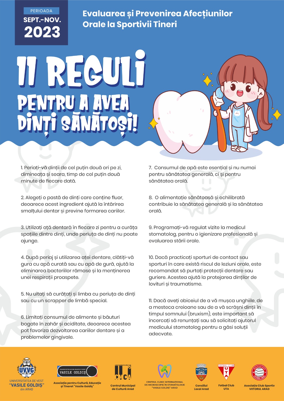 U.V.V.G. Arad, în parteneriat cu Centrul Clinic Internațional de Microscopie în Stomatologie Arad, Asociația pentru cultură și tineret „Vasile Goldiș” Arad, UTA Arad, Viitorul Arad, Consiliul Local Arad și Centrul Municipal de Cultură Arad, a derulat acțiunea de prevenție Evaluarea și prevenirea afecțiunilor orale la sportivii tineri, la copiii vârste între 6-14 ani.