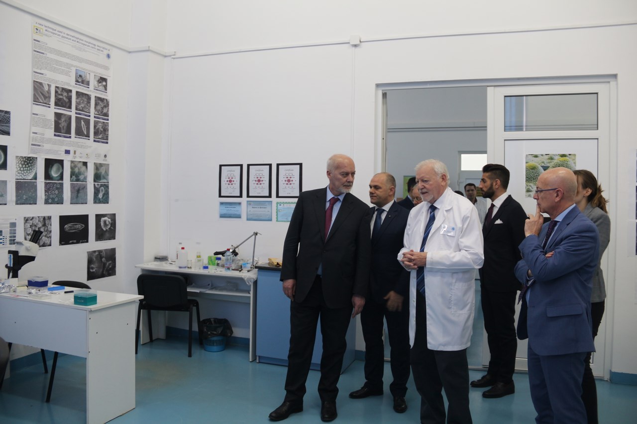 Excelenţa Sa a avut o întrevedere cu reprezentaţii Conducerii Universităţii – prof. univ. dr. Coralia Adina Cotoraci, rectorul Universităţii, prof. univ. dr. Aurel Ardelean, preşedintele Universităţii de Vest „Vasile Goldiş”, prorectori, cadre didactice, studenţi şi doctoranzi italieni din cadrul Facultăţii de Medicină a UVVG şi a vizitat săli de curs, laboratoare de cercetare şi Institutul de Ştiinţe ale Vieţii.