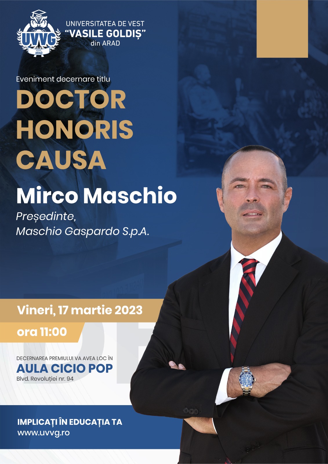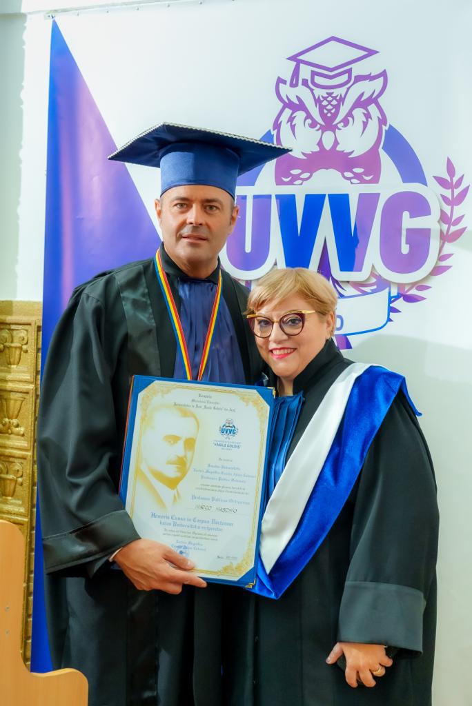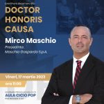 Astăzi, într-un cadru festiv, în Aula Magna „Cicio Pop”, înaltul titlu de DOCTOR HONORIS CAUSA, categoria Beneficiorum publicorum (în beneficiul comunității) al Universităţii de Vest “Vasile Goldiş” din Arad, a fost decernat domnului Mirco Maschio, personalitate remarcabilă a mediului de business, la nivel național și internațional.