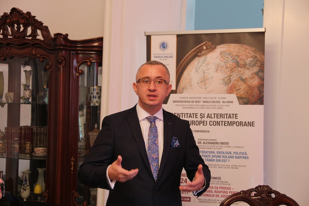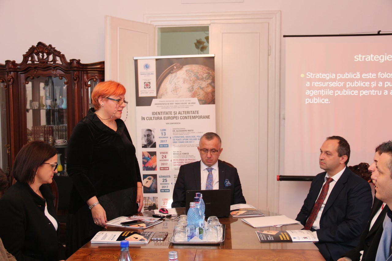 La manifestarea academică finanţată de Centrul Cultural Judeţean Arad, cu sprijinul Fundaţiei Universitare „Vasile Goldiş”, care se înscrie în proiectul intitulat «Identitate şi alteritate în cultura Europei contemporane» organizat de Facultatea de Ştiinţe Socio-Umane şi Educaţie Fizică şi Sport, au participat prof. univ. dr. Coralia Adina Cotoraci, rectorul Universităţii de Vest „Vasile Goldiş”, conf. univ. dr. Cristian Benţe, prorector, prof. univ. dr. Speranţa Milancovici, decanul Facultăţii de Ştiinţe Umaniste, Educaţie Fizică şi Sport, prof. univ. dr. Mihaela Tomiţa, din cadrul Universităţii de Vest din Timişoara, cadre didactice şi studenţi.