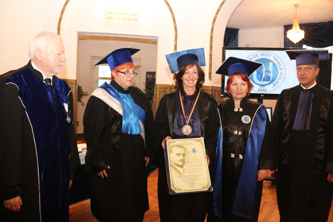 În cadrul manifestării, au fost acordate Diplome de Onoare şi premii de excelenţă cadrelor didactice, studenţilor şi antreprenorilor care au contribuit la promovarea UVVG. O iniţiativă excepţională a doamnei Melania Doina Arghezi a onorat, şi în acest an, întreaga comunitate academică a Universităţii de Vest „Vasile Goldiş”. Doamna Melania Doina Arghezi a înmânat bursa de merit „Doina şi Baruţu T. Arghezi”, studentului Both Adrian Alexandru, din cadrul Facultăţii de Medicină, Anul II.