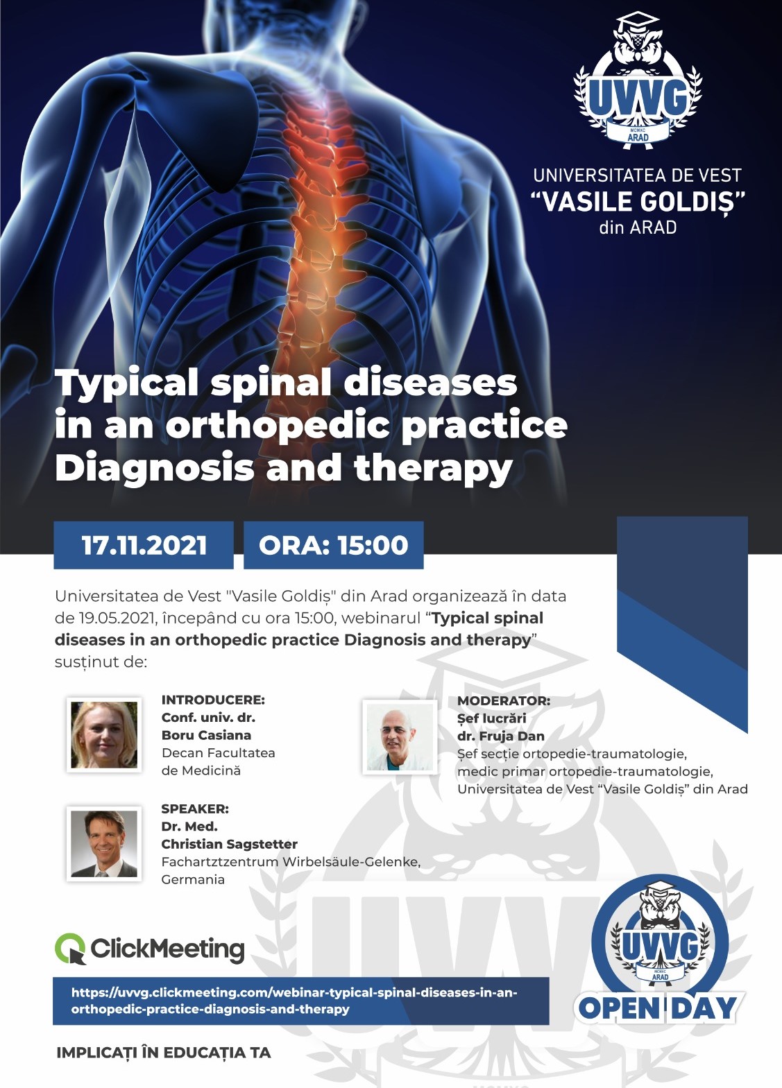 ultimă oră în subiectele prezentate. Aşa au stat lucrurile şi cu ocazia webinarului „Boli tipice ale coloanei vertebrale în practica ortopedică – Diagnostic și tratament, susținut de doctorul Christian Sagstetter, visiting professor al Universității de Vest „Vasile Goldiș” din Arad, expert internațional în domeniul medicinei sportive, a chiroterapiei și acupuncturii.